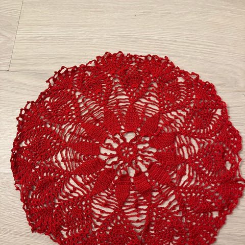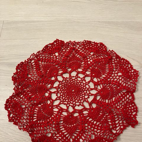 Virkattu pyöreä pitsinen liina punaisesta Novita Virkkauslangasta