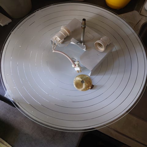 Iso kupu metallia, yläosa muovia. Ison kuvun korkeus n.36 cm, halkaisija alhaalla 29 cm, ylhäällä 6 cm