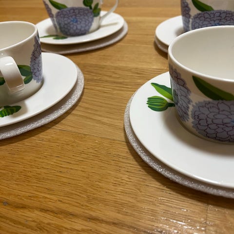 Hyvässä kunnossa olevat mukit, mutta väreissä on jonkin verran vaalentumista.