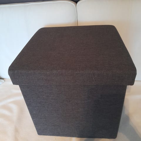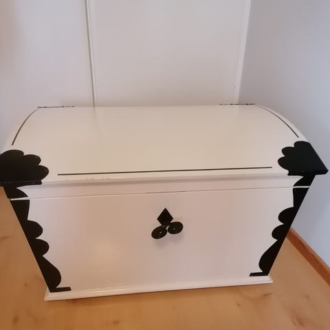 Ruskeaksi petsattu säilytyslaatikko, säilytysarkku. Leveys 44cm, syvyys ja korkeus 25cm. Vanha, kannessa koristeena nimikirjaimet R. K. Eivät näy juurikaan