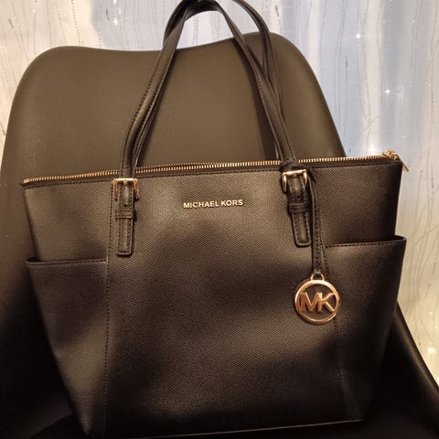 Myydään ruskea Michael Korsin Jet Set Travel käsilaukku kultaisilla yksityiskohdilla. Kaksi suurempaa taskua ja keskellä vetoketjullinen tasku. Sisällä lisäksi useampi pienempi tasku.