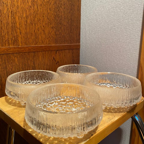 6 kpl kulhoja ja yksi pienempi astia, ehkä sokerikko. Kunnossa ei mitään sanomista. 18 e / kpl