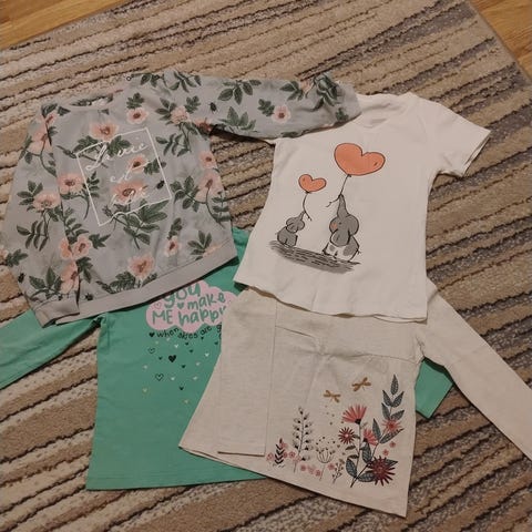 T-paita (120 cm) ja 2 toppia (116 cm). Ollut samaan aikaan käytössä. Meillä on kissa.
