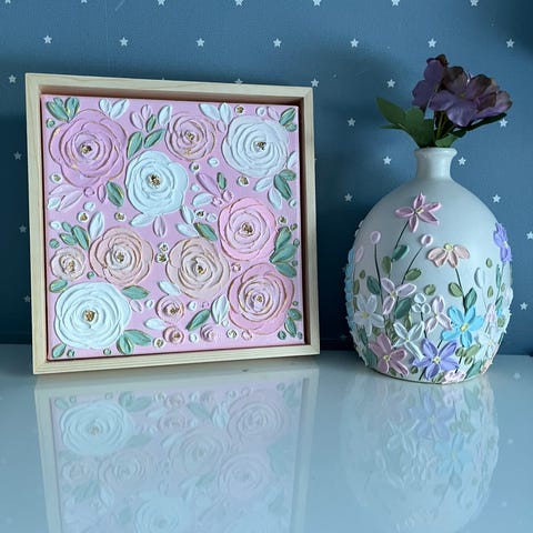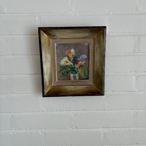Kukkataulu, öljyvärityö kankaalle. Kankaassa painaumia, signeeraus Järvinen.
