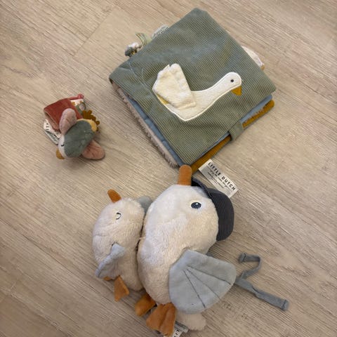 Vauvan käytettyjä leluja: helistin (halilit, uutena ostettu, kahdella lapsella käytössä ollut), norsuauto (fisher price, työnnettäessä pallot liikkuvat auton sisällä), kylpykirja (oppijailo), uniriepu (vaaleanpunainen little dutch, uutena ostettu ja yhdellä ollut käytössä) ja mehujehu.