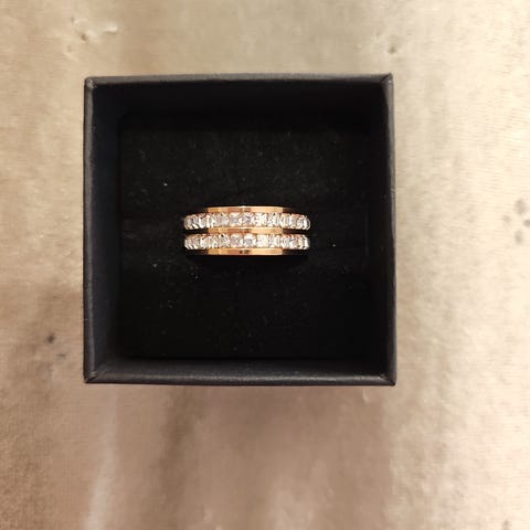 Ruusukullanvärinen sormus. Kolminkertainen. Koko 18,1 (8). Ruostumatonta terästä. Myytävänä myös muualla. Postitus onnistuu myös kirjeenä 2,80e.