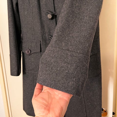 Tummanharmaa siisti takki.Puhdas ja tuoksuton.Vuori 100%polyester ja päälliskangas 60%polyester ja 40%villaa.Voin postittaa.