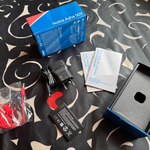Nokia Asha 300 kosketusnäyttöpuhelin. Mukaan laturi ja ohjekirja.