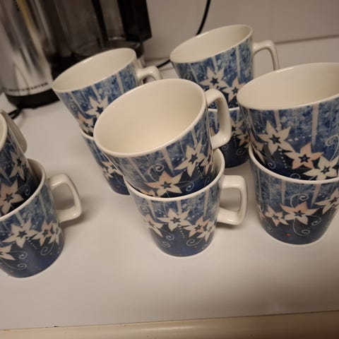 Kultakeramiikan kaksi Katja Saarion suunnittelemaa mukia. Mukeissa enkelit. Käyttämättömät.