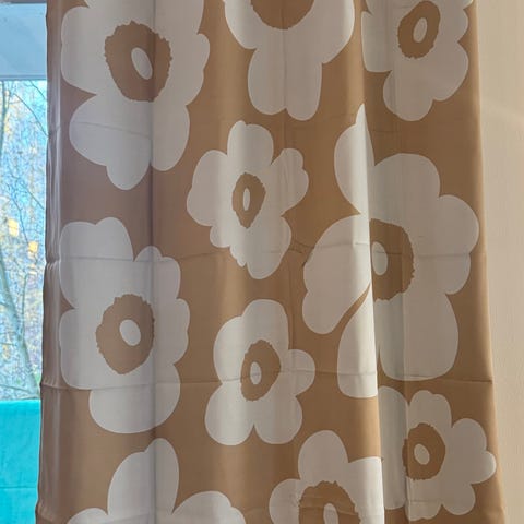 Kangas on paksua "hurstia" pysyvät ryhdikkäästi ikkunassa. Taiteillijan allekirjoitus näkyy alakäänteessä. Verhoja pystyy pidentään n. 9 cm avaamalla alasauman.