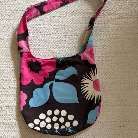 Marimekon kompotti kangas olkalaukku. Tukevaa kangasta. Sisällä yksi lokerikko. Uuden veroinen. Ei käytetty.