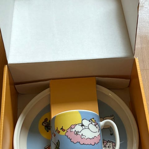 Myynnissä ihana Arabian Muumi-lastenastiasto Lentävät muumit. Ollut tuotannossa 2003-2012. Astiastoon kuuluu lautanen ja muki. Otettu kuvausta varten pois alkuperäisestä paketistaan. Paketti on ehjä, mutta siinä on joitain jälkiä, näkyy kuvassa. Hp 65e. Myynnissä myös muualla. Nouto Vantaan Asolasta.