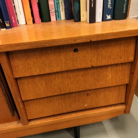 Myydään ylimääräiseksi jäänyt 50-luvun kirjakaappi. Tumman ruskeaksi petsattu. Hyllyssä on urat lasioville joita ei ole.
