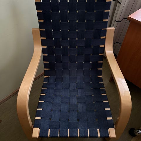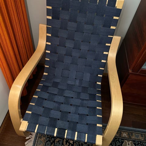 Tuoli on ikäisekseen oikein hienossa kunnossa, jaloissa pientä kolhua ja kulumaa, istuinkankaassa - joka siis on Artekin omaa tuotantoa, mutta selkeästi harvinaisempi kuin satulavyöt, joita näissä useimmiten on - pieniä tahroja, mutta istuinkin oikein hyväkuntoinen, ks. kuvat tarkemman kunnon osalta.