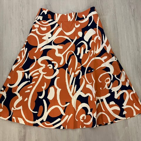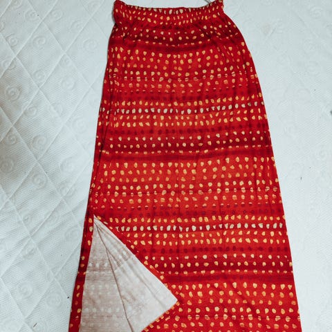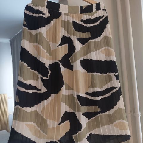 Musta pohja, valkoisia pilkkuja. Materiaali: 100% polyesteri. Pituus 70 cm, vyötärö on venyvä (100 senttiin asti). Voin postittaa