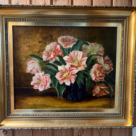 Maalaus esittää värikästä kukkakimppua. Teos on tehty öljyväreillä kankaalle ja kehystetty. Sopii sisustukseen ja taidekokoelmiin.