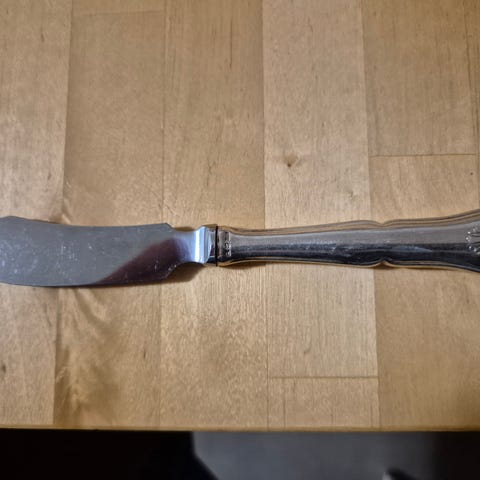Chippendale hopeinen juustoveitsi, jossa on sahalaitainen terä ja koristeellinen kahva. Sopii juustojen leikkaamiseen ja tarjoiluun. Tuote on pakattu alkuperäiseen laatikkoon.
