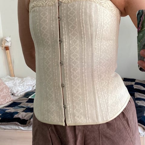 Teetin tämän korsetin häitäni varten Viipurin korsetti -liikkeessä Helsingissä. Korsettia voivat käyttää monen kokoiset (itse olin häissäni xl-xxl -kokoa) ja sen voi viedä myös muokattavaksi liikkeeseen. Korsetti maksoi 500 euroa