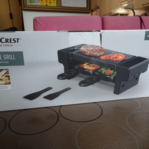 Vain pari kertaa käytetty SilverCrest sähköllä toimiva Raclettegrilli irrotettavalla ja helposti pestävällä grillipinnalla, monikäyttöinen, sopii uuniin, kalan ja lihan grillaamiseen sekä kuorrutukseen. Alumiininen grillilevy, jossa non-stick-pinnoite, kestää jopa 250 °C. Mukana 8 pientä pannua ja 8 pientä puulastaa. Lämpöelementti ja lämpötilansäädin ruostumatonta terästä. 8-pinnoitteinen irrotettava levy ja pannut helpottavat puhdistusta. Mitat: 36,5 x 23,5 cm. Johdon pituus 180 cm.