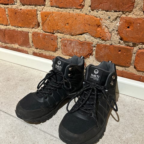 Kengät ovat olleet käytössä, mutta ovat laadukasta Haltin tekoa ja ovat kaikinpuolin ehjät (poislukien toisen kenhän rikkoutuneet kiinnikkeet, katso viimeinen kuva). Suojaavat jalkoja hyvin kylmältä ja märältä, kangas ja pohja ehjä.