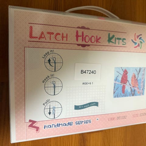 Tuftaus setti mihin kuuluu kaikki tarvittava kovassa salkussa. Mukana tarvittava pohja mihin kuva on painettu taustakangasta vasten, valmiiksi leikatut langat sekä tuftaus neula. Mukana myös ohjeet.