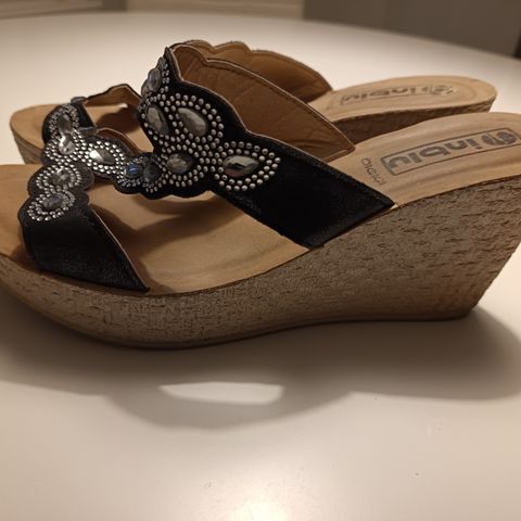 Naisten kiilakorkosandaalit, koko 39. Sandaalit ovat hopeanväriset ja niissä on säädettävä nilkkahihna. Korko on musta ja kiilamallinen. Nahka. Vain nouto.