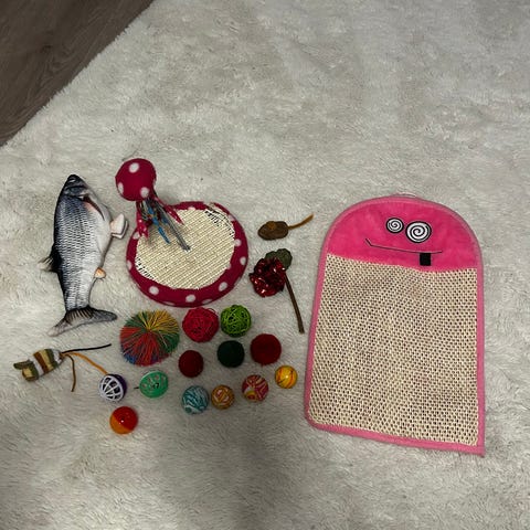 Uusia leluja, joilla ei ole leikitty, ainoastaan sinisellä perhoslelulla kissa muutaman kerran innostui, silti hyväkuntoinen. Kaikki yht. 5€