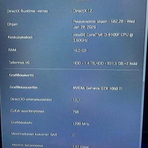 Pelitietokone / I5 9500 / Gtx 1060 / 8Gb / 256Gb / 1Tb