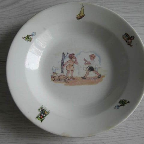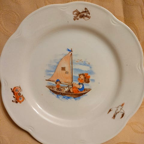 Myynnissä käytössä ollut Arabian lastenastiaston lautanen. Pohjassa vuoden 1949-64 kruunuleima.