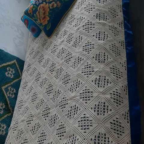 Upea käsin kalastajanlangasta virkattu keltainen sängynpeite 210*230cm. Kudos on napakkaa ja peite kuin uusi.