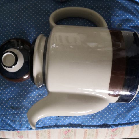 Arabia Carelia X-model? kannu vuodelta -62. Vetoisuus n. 1,3 l. Korkeus 17 cm. Raija Uosikkinen, Kaarina Aho. Lasitteessa muutama viimeisessä kuvassa näkyvä neulanpään kokoinen reikä.