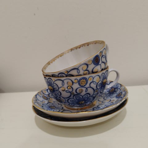 Hyvässä kunnossa Lomonosov tee astiat.4 kpl.teekuppi + 4 kpl.lautasta.Kaikilla punainen LFZ leima.Yht.160€.