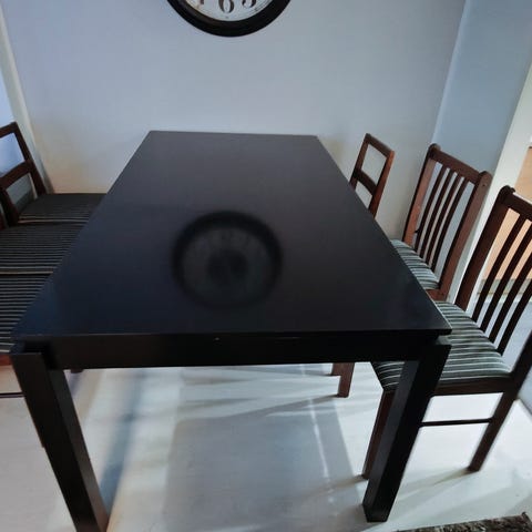 Muuten ok kunnossa, mutta kolhuja löytyy pöydän reunoista. Yhdessä jalassa halkeama. Ei vaikuta käyttöön.