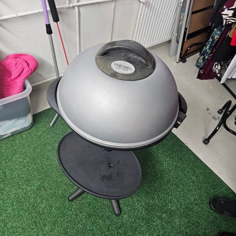 The electric grill is like new. It is clean. It works without any problems. It can be used indoors or outdoors.