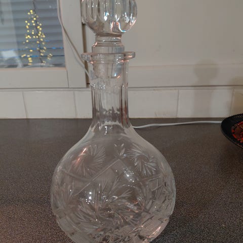 Kauniilla lasikorkilla varustettu kirkaslasi kirahvi. Korkeus n. 30 cm. Siisti ja hyvä.
