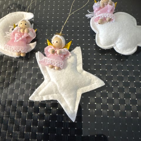 Joulukuusenkoristeet/koristeet. Saa roikkumaan, saa myös muualle ja nauhan katkaistua. Puinen enkeli, lasienkeli ja posliinkenkeli. Saa myös yksittäin. 1 e/kpl