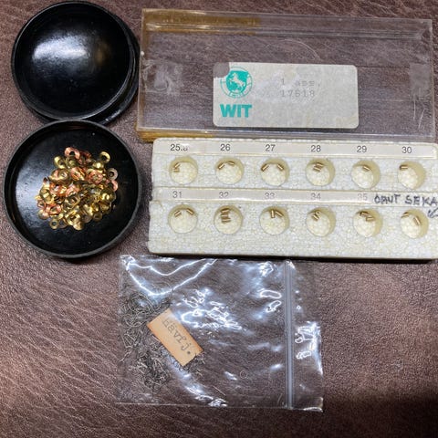 Kellosepän varaosia, nuppiputki- jousi- ja tauluprikkalajitelma