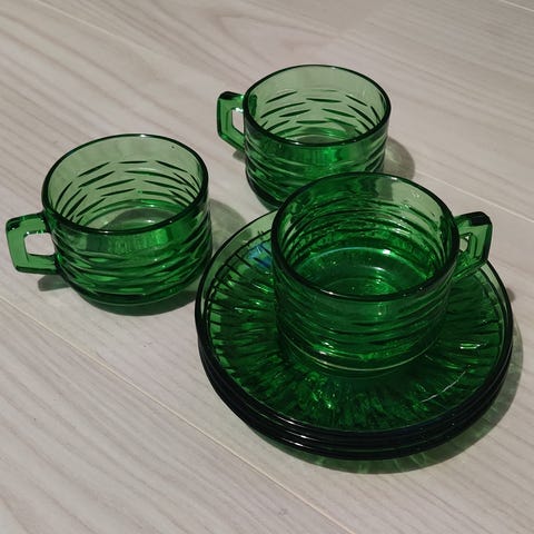 Kermasaven vihreä astiasto, 20 kuppia+ lautaset,kermakko ja sokerikko, 2 pientä tarjoiluastiaa sekä isompi tarjoiluastiaa.