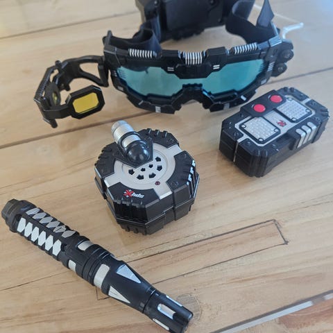 Espionage Set leikkisetti sisältää aurinkolasit, kynän, avaimenperän ja muita vakoiluun liittyviä leluja. Setti on tarkoitettu lasten leikkeihin ja sisältää erilaisia vakoiluvälineitä hauskaan roolileikkiin.