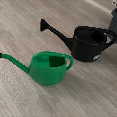 Kaksi ehjää, käyttökelpoista pientä kastelukannua, jotka ovat olleet ulkokäytössä. Niiden tilavuus saattaa olla litran tai parin luokkaa. Hinta 1,5 euroa/kpl.