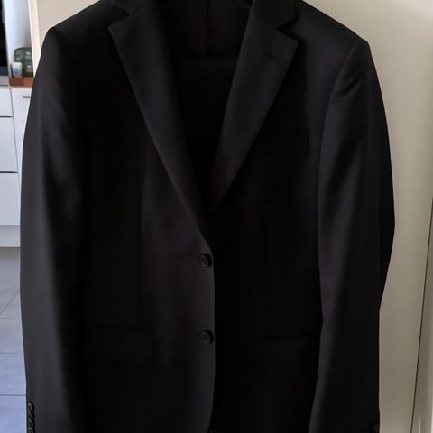 Pari kertaa pidetty musta puku (takki ja housut) ja valkoinen puvun paita. Puku on slim fit -mallinen, takki kokoa 46 ja housut 30/30. Paita (puuvillastrech) on kokoa S 37/38. Puku ja paita ovat virheettömässä kunnossa.