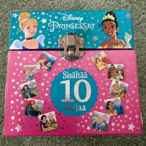 Pinkki kannella ja rullilla varustettu säilytyslaatikko. Toisella sivulla Disney-prinsessojen kuvat, ja kannessa kohokuvio. Valmistettu muovista. Laatikko on pinottava. Klipsikahvat pitävät kannen paikoillaan. Tilavuus n. 32 litraa. Ulkomitat n. L 40 x P 80 (kahvojen kanssa) x K 18 cm. Valmistaja Storyline Espanja.