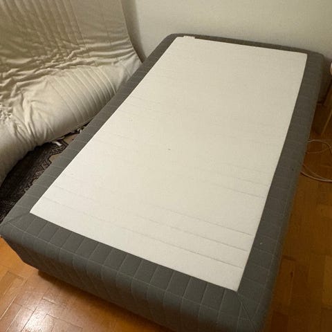 IKEA SKOTTERUD puolikiinteä runkopatja + jalat. Koko 120x200x34cm. Jalkojen korkeus 20,5cm. Yhdessä alakulmassa pieni paikattu reikä. Hinta uutena 379€.