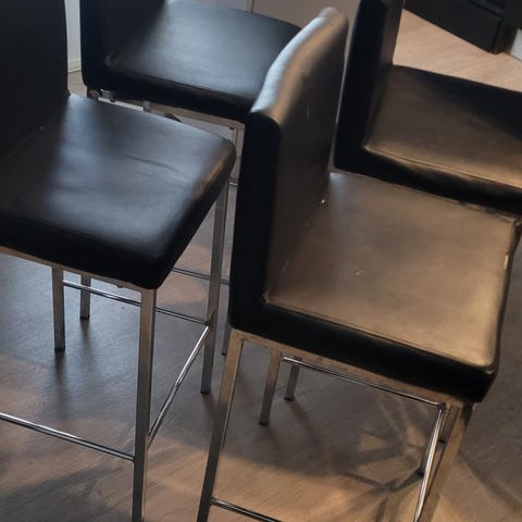 6 kpl baarituoleja. Istuinkorkeus 65cm, istuinleveys 46cm.