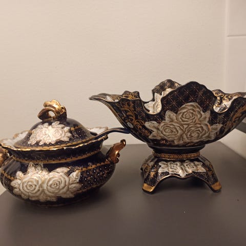 Kahvikupin alulautaset ja ruokailulautaset (matalat ja syvät) 12 kpl. Kermakko ja sokerikko.