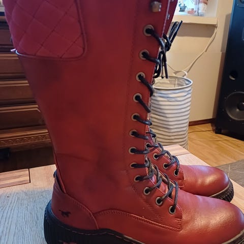 Valkoiset kauniit Mustang saapikkaat, nyörit takana.