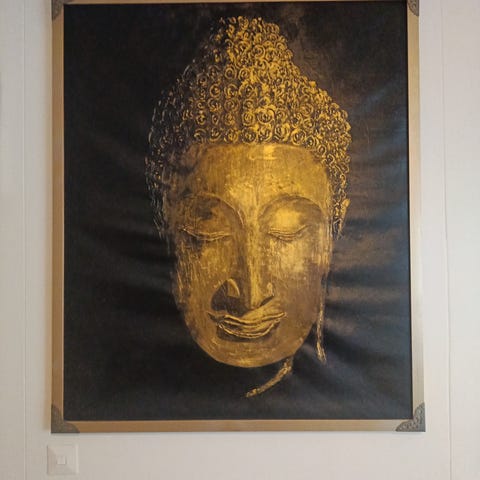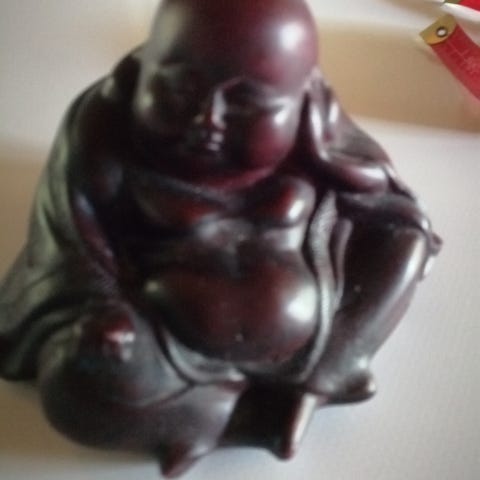 Kullanvärinen Buddha patsas. Korkeus 12cm.