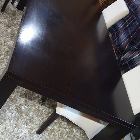 Iskun valkoinen ruokapöytä, materiaali koivua. Erittäin tukeva ja jykevä. Yleisilme siisti, mutta käytön jälkiä useassa kohtaa. Jalat irrotettavissa.
