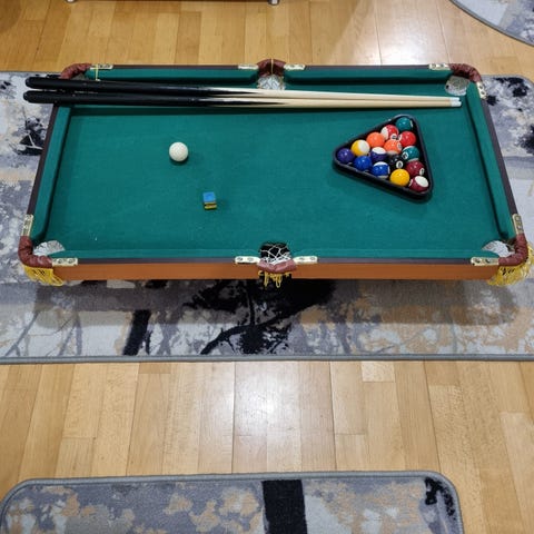 Kuvan mukainen pöytäbiljardi. Sisältää biljardipöydän, mailat ja pallot. Sopii sisäkäyttöön ja tarjoaa pienen koon vuoksi helpon sijoitettavuuden erilaisiin tiloihin.