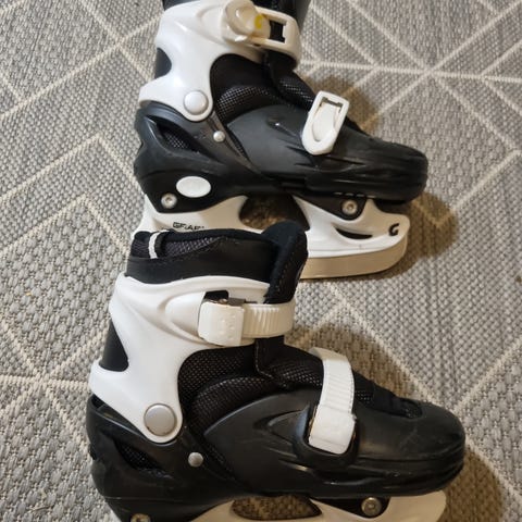Lasten säädettävät luistimet koko 31-34. Merkki Graf. Paljon käytetty mutta edelleen toimivat. Toisessa luistimessa tarra heikko mutta pysyy kiinni.